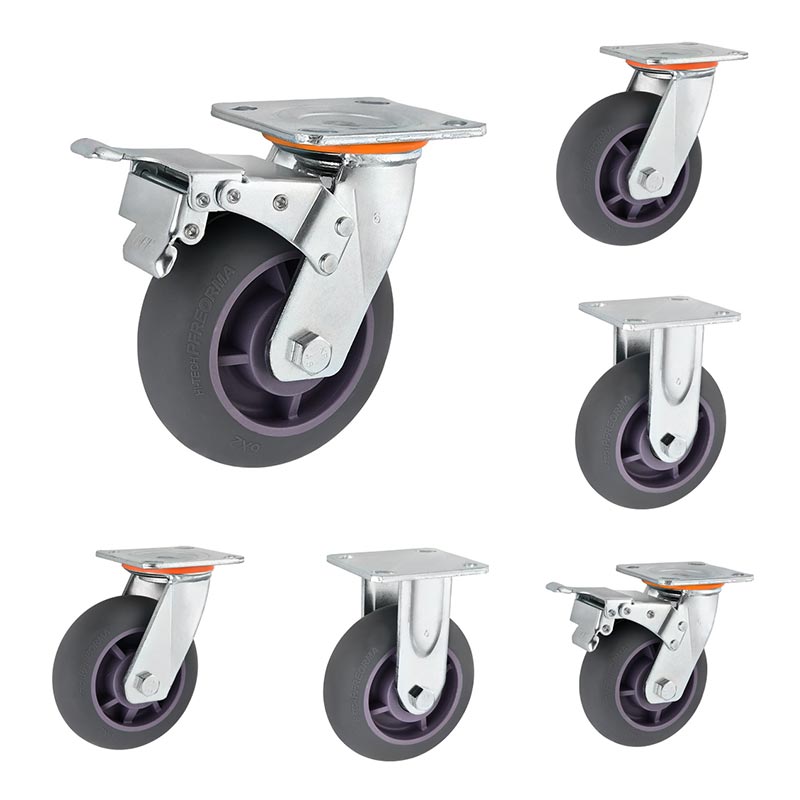 Hlavní běhouny odolné termoplastické gumy (TPR), které kombinují sílu gumy se zvýšenou odolností proti opotřebení. Konstrukce zaobleného běhounu zajišťuje hladké válcování a vynikající manévrovatelnost, a to i při těžkých nákladech. Tato kolečka, ideální pro průmyslové vozíky, logistické vybavení a drsné podmínky na pracovišti, nabízejí vynikající absorpci šoků, ochranu podlahy a dlouhodobý výkon.